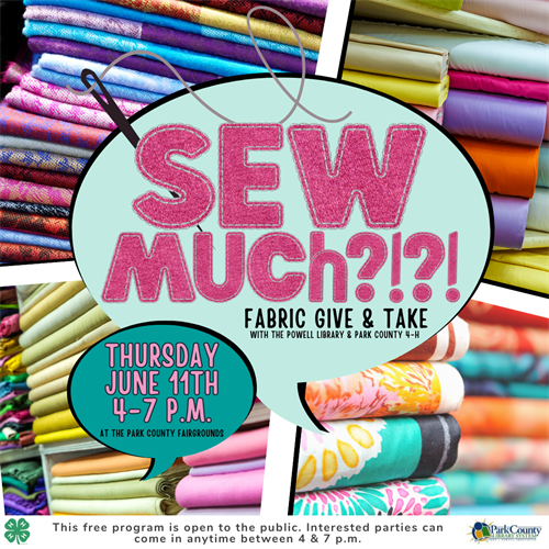 If so, come to the Sew Much?!?! Fabric Give & Take that is being co-hosted by the Powell Library and Park County 4-H on Thursday, June 11th from 4 to 7 p.m. at the Park County Fairgrounds